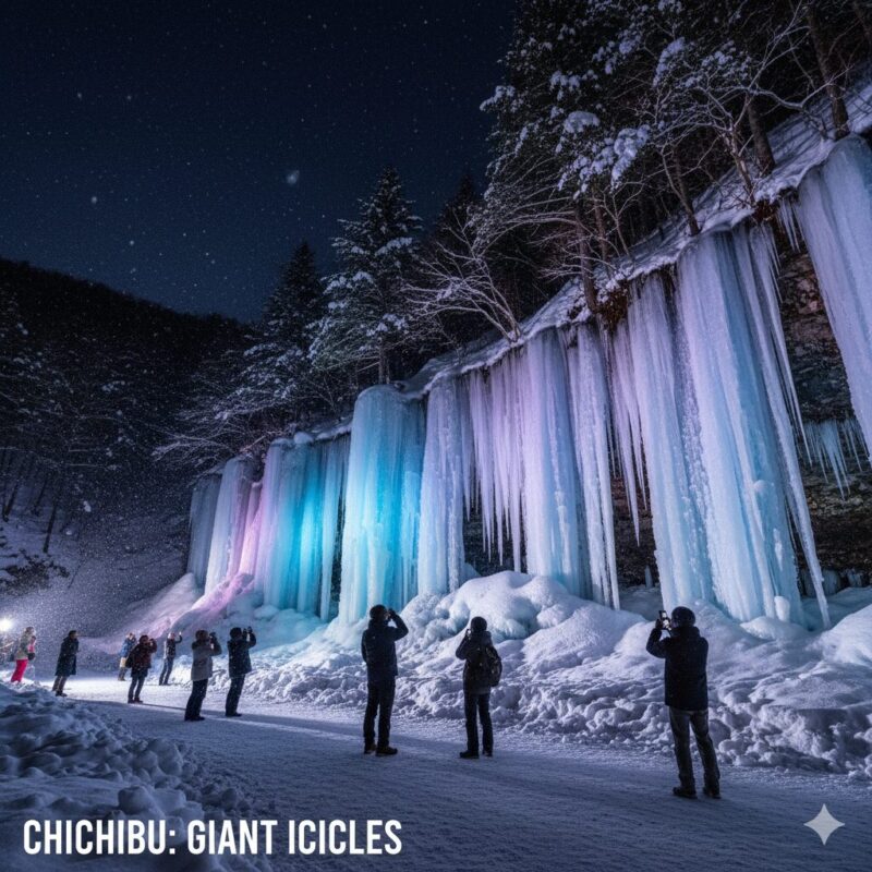 Why go: Close to Tokyo (2 hours by train), Chichibu’s natural icicle formations are among the most remarkable winter phenomena in the region. Night light-up turns them into an unforgettable spectacle of blues and purples reflecting off massive ice columns. The area also hosts the famous Chichibu Night Festival in early December. Winter hiking trails, local sake breweries, and soba restaurants add to the appeal. Combine with visits to nearby Nagatoro for scenic winter river views.