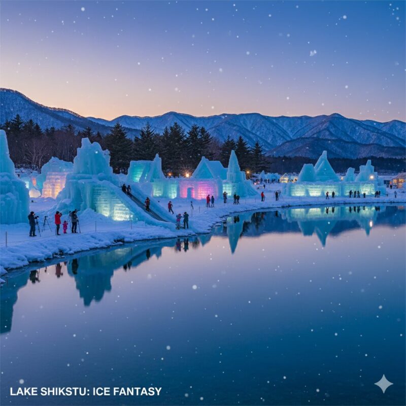 - Lake Shikotsu Ice Festival: Late Jan–late Feb (e.g., Jan 31–Feb 23, 2026); evening illuminations with color-changing LED lights create magical ice sculptures.