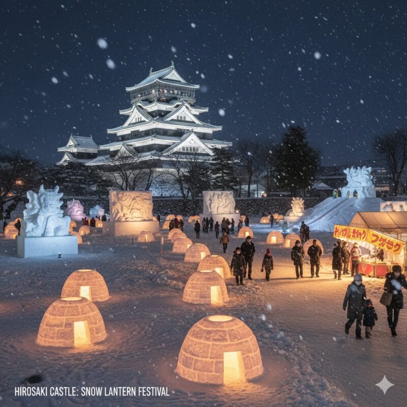 Hirosaki Castle Snow Lantern Festival (Aomori): Early February with snow lanterns and small kamakura huts lighting the historic park, with hundreds of snow lanterns creating a warm glow against Hirosaki Castle. The festival also features large snow sculptures, slides for children, and local food stalls serving hot amazake and grilled squid.
