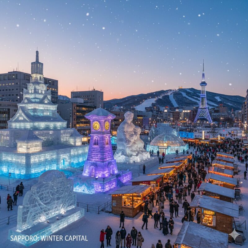 - Sapporo Snow Festival: Early February (e.g., Feb 4–11, 2026). Snow and ice sculptures across multiple sites including Odori Park, Susukino, and Tsu Dome; free entry to outdoor sites.
