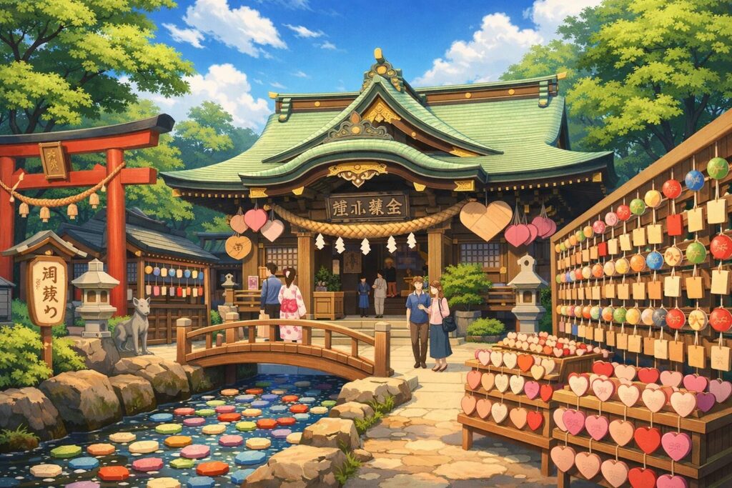 Kawagoe Hikawa is visually stunning and undeniably romantic. It is famous for its “fishing” style omikuji (fortune slips), where visitors use a small rod to fish for a tai (sea bream) figurine containing their fortune. While famous for summer wind chimes, the New Year brings a focus on relationship blessings and “red thread of fate” charms.