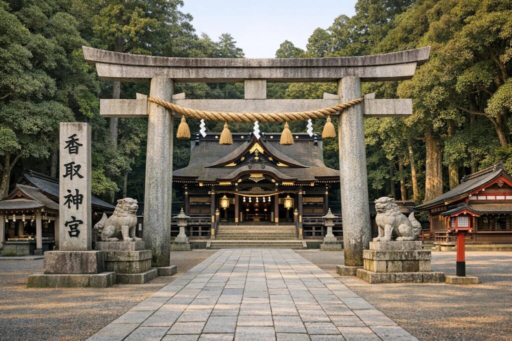 Katori Jingu is known for its “black” main hall (a dark lacquer) which creates a striking, dignified appearance. The atmosphere is often described as mystical or “airy,” possessing a heavy, sacred silence that offers deep tranquility. It is particularly famous for charms protecting against traffic accidents and disasters.